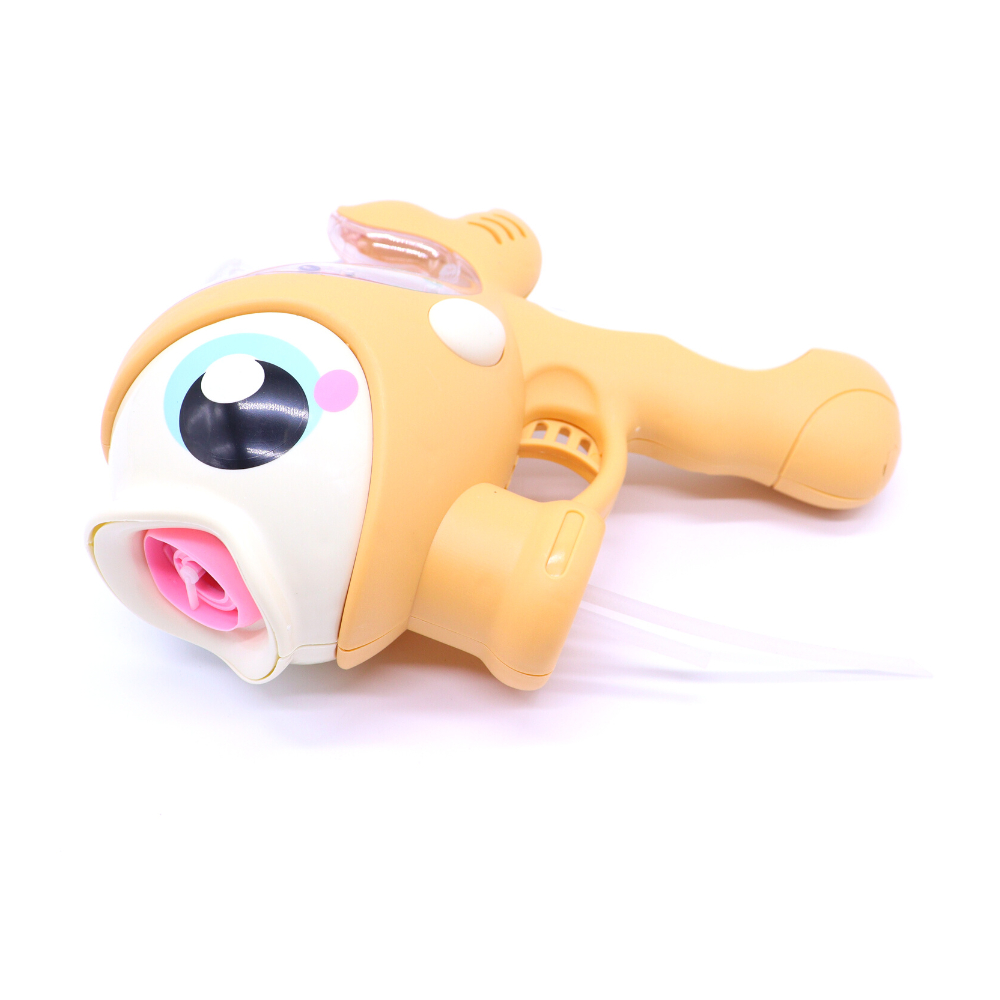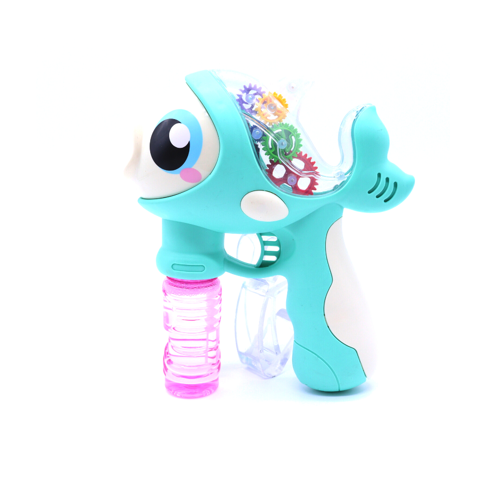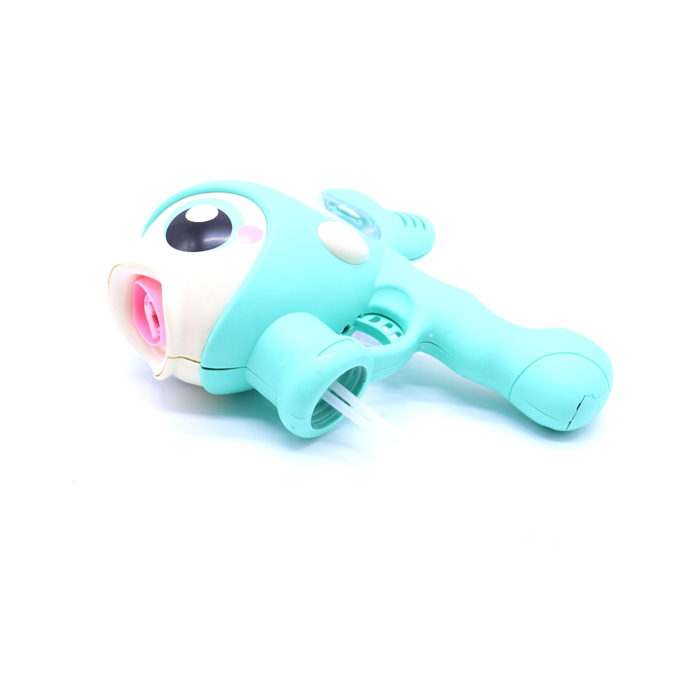 A pistola é modelada no formato de Peixinho, é resistente e fácil de manusear, além de liberar bolhas, a pistola possui LED e toca musica. Proporcionando uma brincadeira bem mais divertida !!!